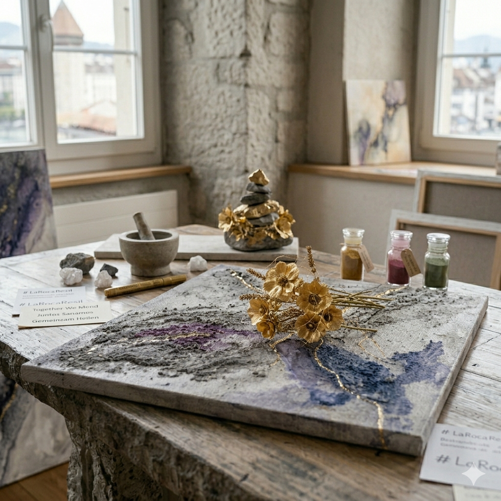 La Estética de la Resiliencia: Jeder Bruch trägt eine Wahrheit in sich. Mein Weg zu “Taller de la Roca” begann nicht in einem Atelier, sondern in der Erkenntnis, dass Heilung kein Verstecken der Wunden ist, sondern deren Veredelung. Ich arbeite mit Brüchen, weil sie die authentischsten Stellen unseres Lebens sind. In meinen Leinwänden spiegle ich den Prozess des Wiederaufstehens wider: Eine Verletzung wird nicht geleugnet, sie wird mit Gold gefüllt. Für mich ist Kunst der Ort, an dem aus Schmerz Stärke wird und aus Fragmenten ein neues, strahlendes Ganzes entsteht.