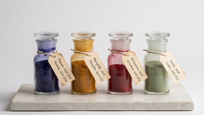 Die Seele: In einem zeitintensiven Verfahren extrahiere ich Pigmente direkt aus frischen Blüten. Diese botanischen Farben bewahren die flüchtige Schönheit des Lebens.